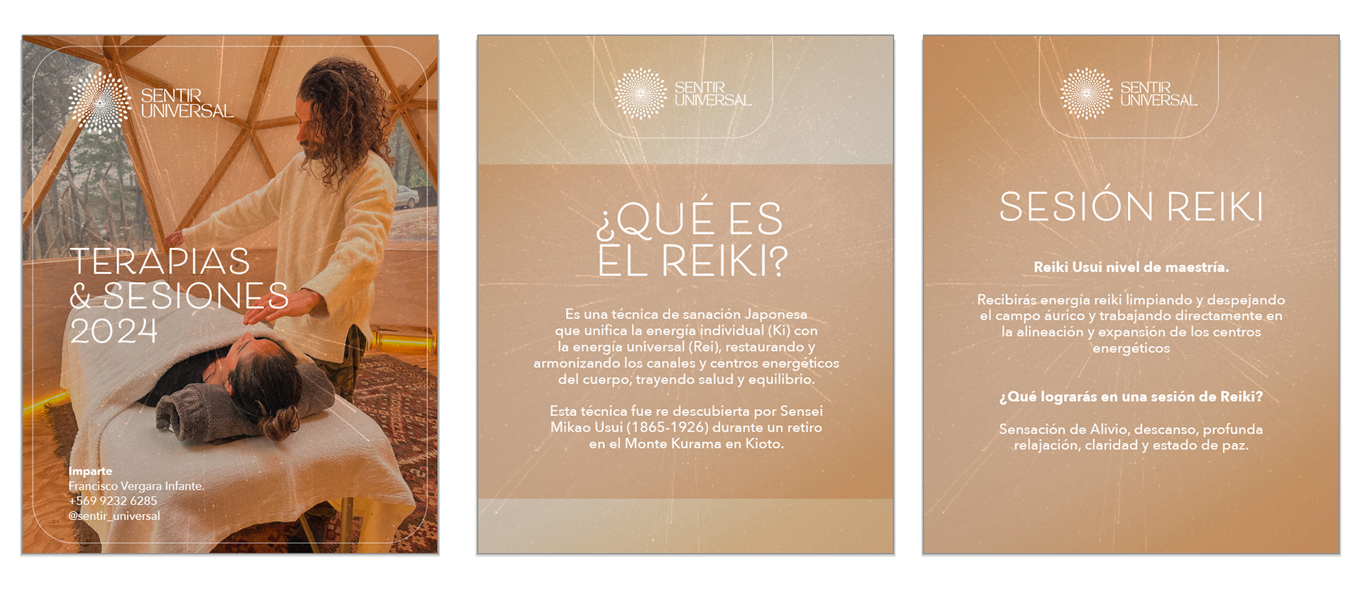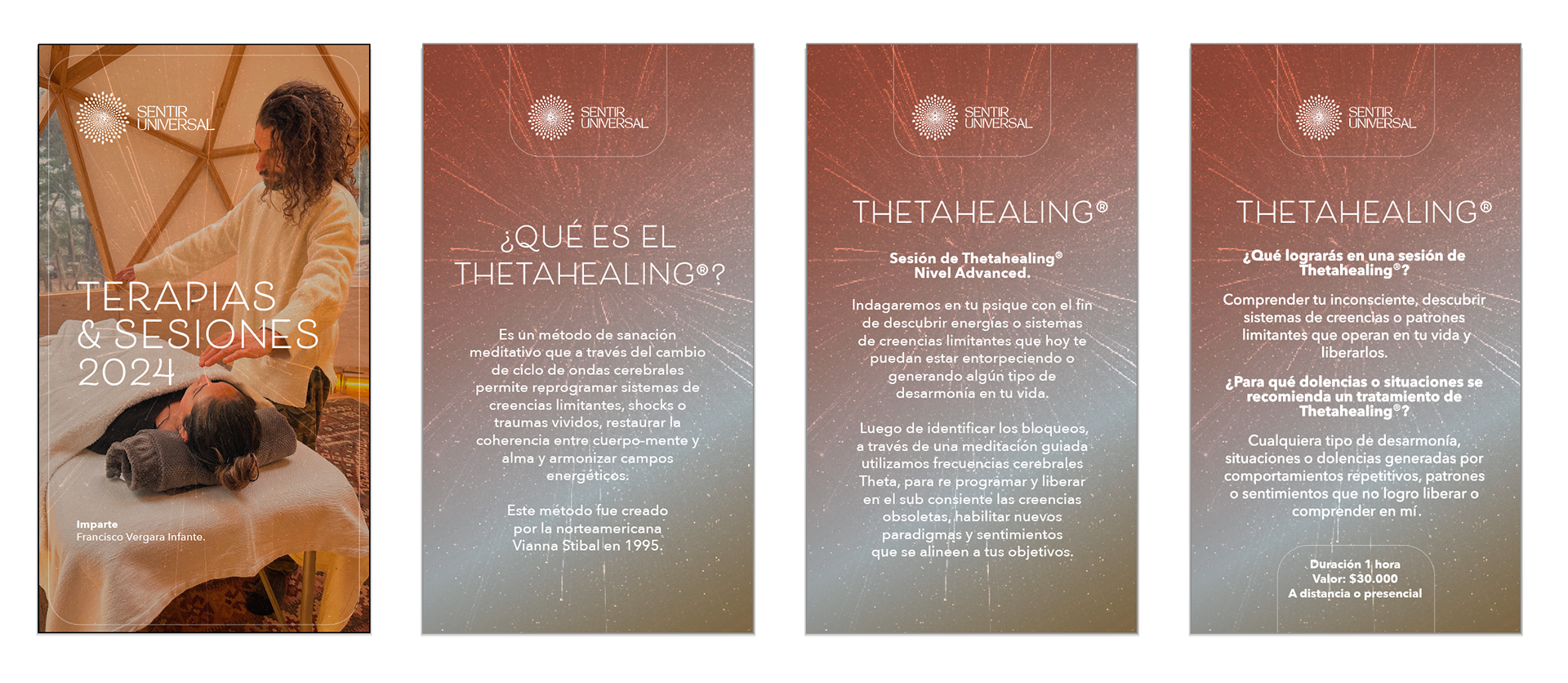 Creación y diseño de identidad visual para Francisco Vergara Infante Terapeuta. Piezas gráficas para redes sociales y documento de presentación de terapias y servicios.